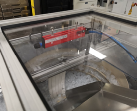 本图片摄于英国某医疗注塑公司,产品沿着斜槽进入碗状进料器。