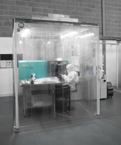 这个移动式洁净室正好覆盖了一台小型注塑机,供一个操作员进行小批量组装和包装工作。