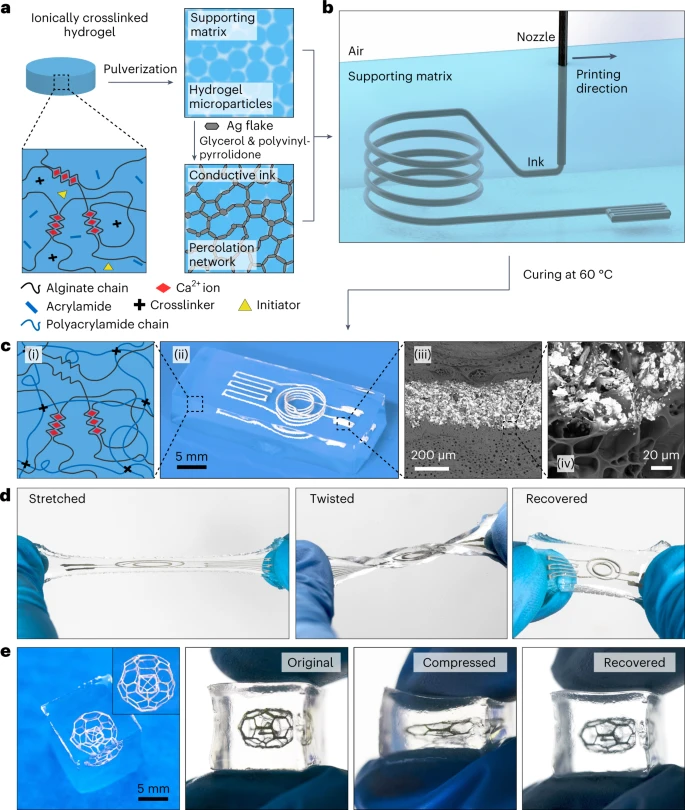 基于水凝胶的电子器件可以与生物组织有内在的相似性,在生物医学应用中具有潜在的用途。理想情况下,这种水凝胶电子器件应该提供可定制的三维电路,但用现有的材料和制造方法制作封装在水凝胶基质中的复杂三维电路是具有挑战性的。