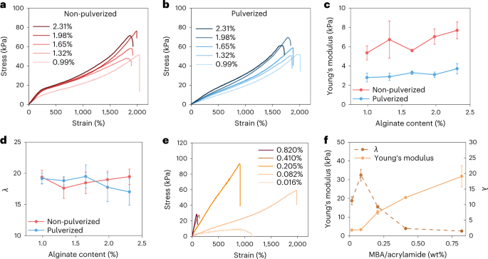 图3a、b比较了通过传统的一锅法(非粉碎)和本文方法(粉碎)制备的藻酸盐-PAM水凝胶在固定交联剂/单体质量比和不同藻酸盐含量下的拉伸应力-应变曲线。随着藻酸盐含量从0.99%增加到2.31%,未粉碎和粉碎水凝胶的拉伸杨氏模量分别从5.35增加到7.69kPa和从2.80增加到3.71kPa(图3c)。在固定的藻酸盐含量(1.65%)下,将水凝胶的交联剂/单体质量比从0.016%提高到0.082%会导致拉伸杨氏模量从3.05略微增加到3.30kPa,但λ从11.3大幅提高到19.5(图3e、f)。
