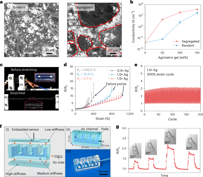 作者制备了具有随机和分离分布的Ag薄片的Ag-水凝胶复合材料。具有随机分散的Ag薄片的复合材料未能形成相互连接的导电通路(图4a)。相反,在分离的复合材料中,Ag薄片在水凝胶域之间的边界处密集堆积并彼此紧密接触(图4a(右红线))。结果,随着Ag/水凝胶质量比分别从0增加到0.5、1.0和1.5,分离的Ag-水凝胶复合材料的电导率从1.5×10–3增加到2.1×101、4.0×102和1.4×103 S cm–1(图4b)。在相同的Ag/水凝胶质量比(0.5、1.0和1.5)下,具有随机分布的Ag薄片的Ag-水凝胶复合材料的电导率分别仅为6.9×10–3、6.9×101和3.4×102 S cm–1。作者接下来表征了Ag-水凝胶复合材料在拉伸应变下的电性能(图4c)。作者使用0.5×Ag、1.0×Ag和1.5×Ag的油墨印刷了线宽为250μm、长度为18mm的线性水凝胶电阻,显示初始电阻(R0)分别为246.5、10.9和3.7 Ω(图4d)。在慢速(5mm/s)循环拉伸试验(300%的应变)下,1.5×Ag电阻的R/R0值在前50个循环中从2.7略微增加到3.1,但之后保持稳定(图4e)。打印的气动执行器可以通过测量曲率传感器的R/R0变化来检测(图4g,f)。