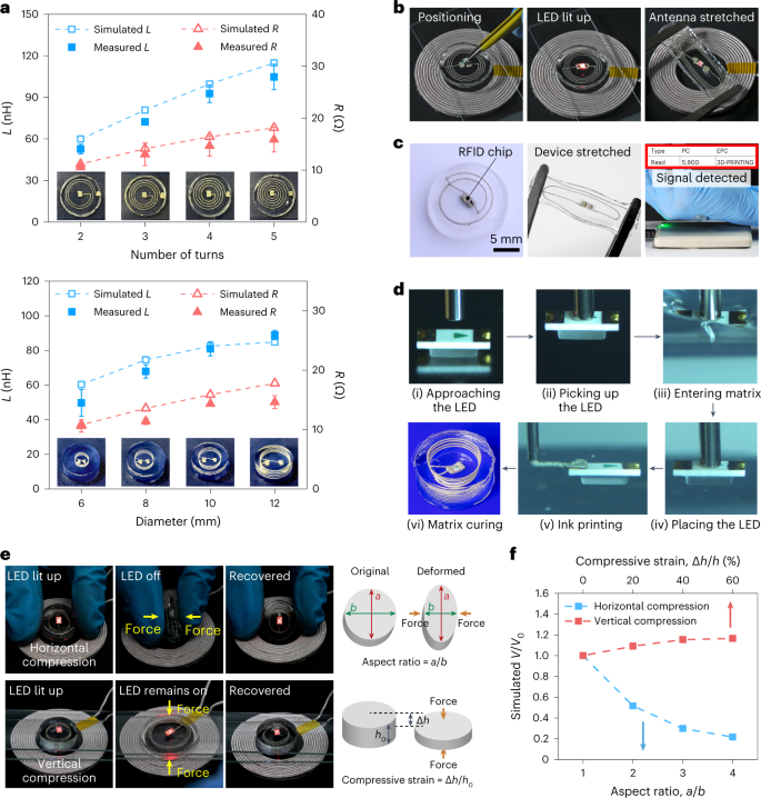 作者报告了使用可固化的基于水凝胶的支撑基质和导电银(Ag)水凝胶墨水的水凝胶电子的EM3DP。颗粒状的离子交联水凝胶表现出一种屈服应力的流体行为,使其能够适应具有高导电性(1.4×103 Scm-1)和伸展性的导电油墨的沉积。当喷嘴产生的剪切应力大于屈服应力时,3D打印机喷嘴的运动会使水凝胶基质过渡到暂时的流体状态,然后再返回到固体状态。打印后,基质和墨水可以通过激活共价交联机制而固化在一起,从而形成柔软(杨氏模量,< 5Ka)和可拉伸(伸长率约18)的整体水凝胶,将电路包裹起来。作者使用3D打印方法来创建一系列基于水凝胶的电子设备,包括应变传感器、配备曲率传感器的执行器、电感和生物医学电极。发光二极管(LED)和射频识别(RFID)芯片等电子元件也可以通过自动混合打印工艺轻易地纳入电路中,以扩大打印设备和电路的功能。