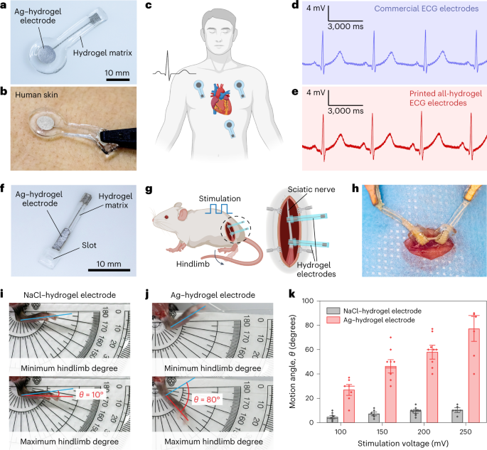 为了说明EM3DP技术的多功能性,作者制造了一系列不同的水凝胶电子设备:电阻传感器、配备曲率传感器的执行器、电感器和生物医学电极。印刷设备表现出出色的机械稳定性和电气性能(图5a-f),以及与外部环境(如商业组件、设备引线和生物组织)的简单和保形接口(图6a-k)。与现有的水凝胶电子产品制造方法相比,本文的材料和制造方法可提供高精度、可设计性和自动化。因此,该方法应该为用于诊断和治疗设备的柔软、可定制的3D水凝胶电子设备开辟新的设计可能性。