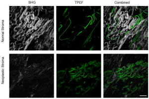 图 1 正常人体食管基质与癌变基质的SHG图像、TPEF图像、SHG/TPEF复合图像[6]
