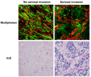 图 2 突破浆膜层和未突破浆膜层胃癌的多光子成像和HE染色成像[7]