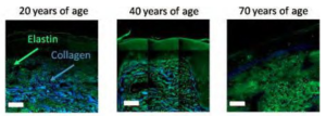图 3 不同年龄人皮肤真皮层SHG/TPEF图像[8]