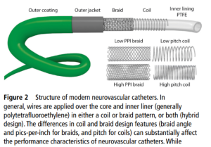 导管构造的基本概念在各种器械中都得到了相当好的保存。简而言之,导管必须足够大以容纳介入工具和/或造影剂注射,足够小以兼容标准动脉通路鞘管,足够硬以提供近端支持,但足够软以穿过迂曲的解剖结构向远端跟踪,抗扭结,足够光滑的内腔便于器械插入,沿外腔以增强跟踪。为了实现这些无数的功能,基本的结构模式包括四个元素,包括极薄的光滑内衬,通常为聚四氟乙烯(PTFE),通常由金属材料构成的支撑骨架,聚合物外管,最后是亲水涂层,后者通常仅限于器械的远端部分。这些材料的结构、厚度、模型和范围长度等都是根据给定的临床指征定制的,以实现必要的远端跟踪和器械通过。