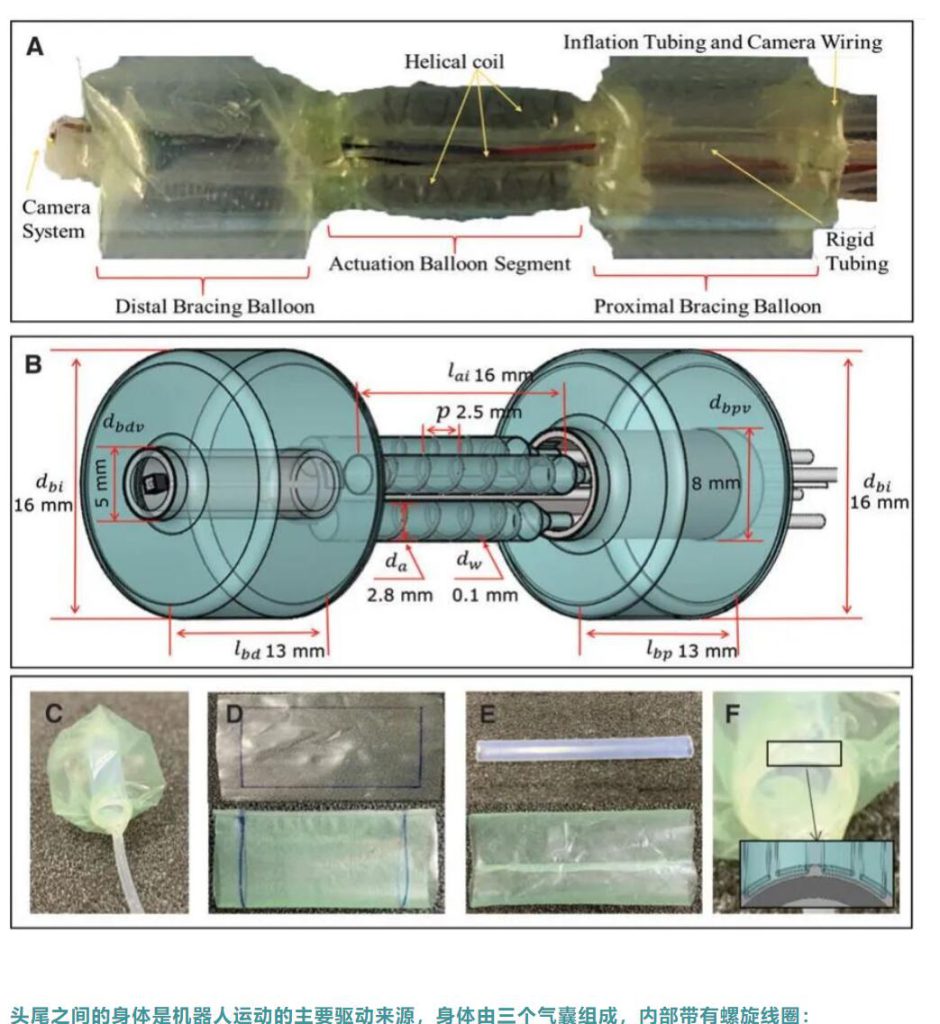 机器人包括头、身体和尾巴,均由球囊组成;其中头和尾巴的球囊用于径向扩张以产生牵引力,头腔内装有微型摄像头;头尾的结构是环形的,管内腔开放,这种结构既方便呼吸,又为成像系统提供了一条通道。