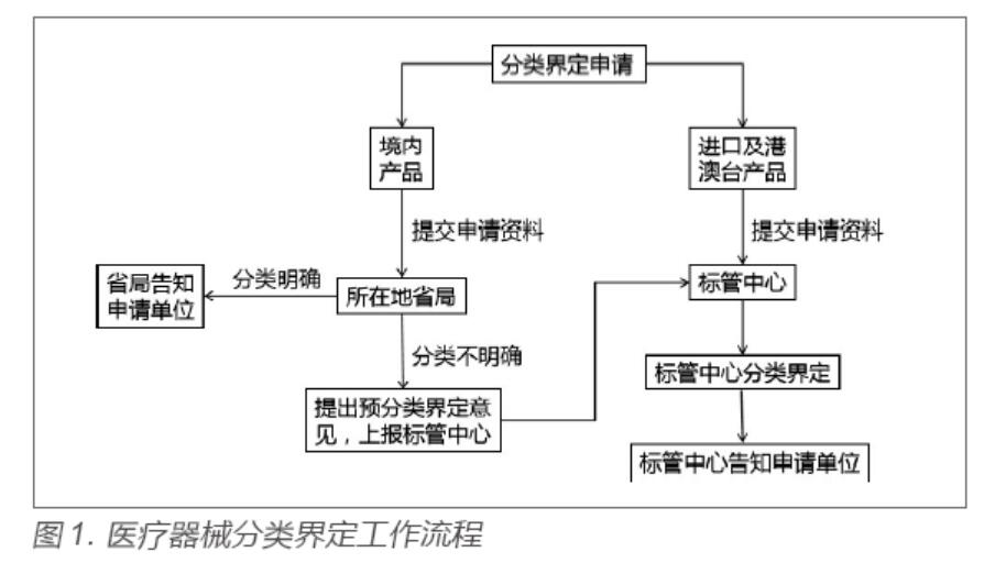 国家药监局医疗器械标准管理中心(以下简称“标管中心”)、省级药品监督管理部门(以下简称“省局”)是分类界定工作的主要管理部门。其中,境内产品的分类界定向所在地省局申请,省局对管理属性和分类明确的产品直接告知申请单位,对管理属性和分类不明确的产品提出预分类界定意见并上报标管中心进一步界定。标管中心负责对进口及港澳台产品的分类界定申请和省局出具预分类界定意见的分类界定申请组织研究审查,并将界定结果告知申请单位,具体工作程序如图1 所示[3]。