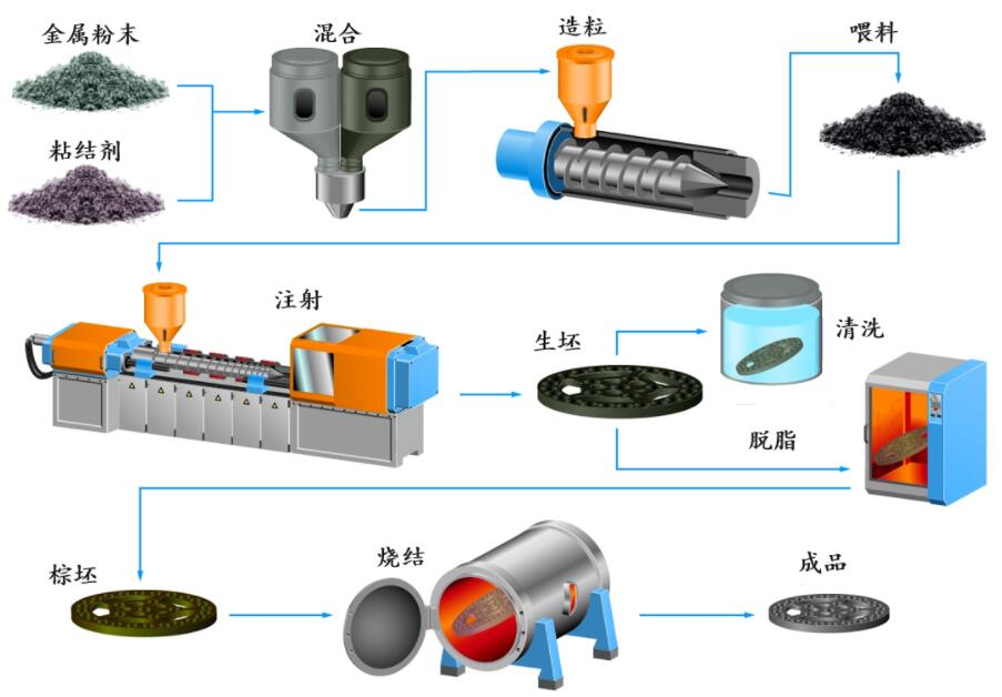 MIM使用注射机成型产品生坯,生产效率大幅度提高,适合大批量生产;同时注射成型产品的一致性、重复性好,从而为大批量和规模化工业生产提供了保证。