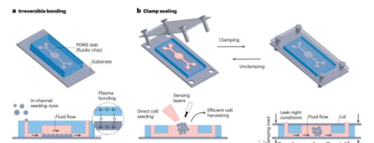 微生理器官芯片(OOC)已成为解决现有临床前模型缺点的替代体外平台。目前的OOC设备通常由PDMS板粘合在一起或靠在基板上制成,以形成培养基可以流动的密封通道(图1a)。因此,密封是决定OOC技术的可重复性和稳健性的主要因素之一。密封微流体装置的策略可分为两类:不可逆键合和可逆密封。