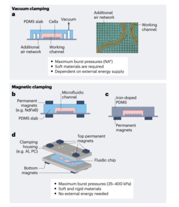 通过等离子体处理的不可逆键合是目前密封微流体装置的最常用方法,尤其是由PDMS制成的装置(图1a)。然而,不可逆密封会产生永久性结合,因此除非被破坏,否则无法打开该装置。因此,细胞通常必须通过封闭、狭窄的通道进行播种或收获,这使得细胞培养劳动密集型,尤其是在使用复杂的生物工程3D生物结构时。此外,可通过将夹紧机构纳入OOC设计来实现可逆密封。与不可逆技术不同,夹具创建了一个可以重复安装和拆卸的密封界面(图1b),同时提供与等离子键合相当甚至更高(高达600 kPa)的键合强度。