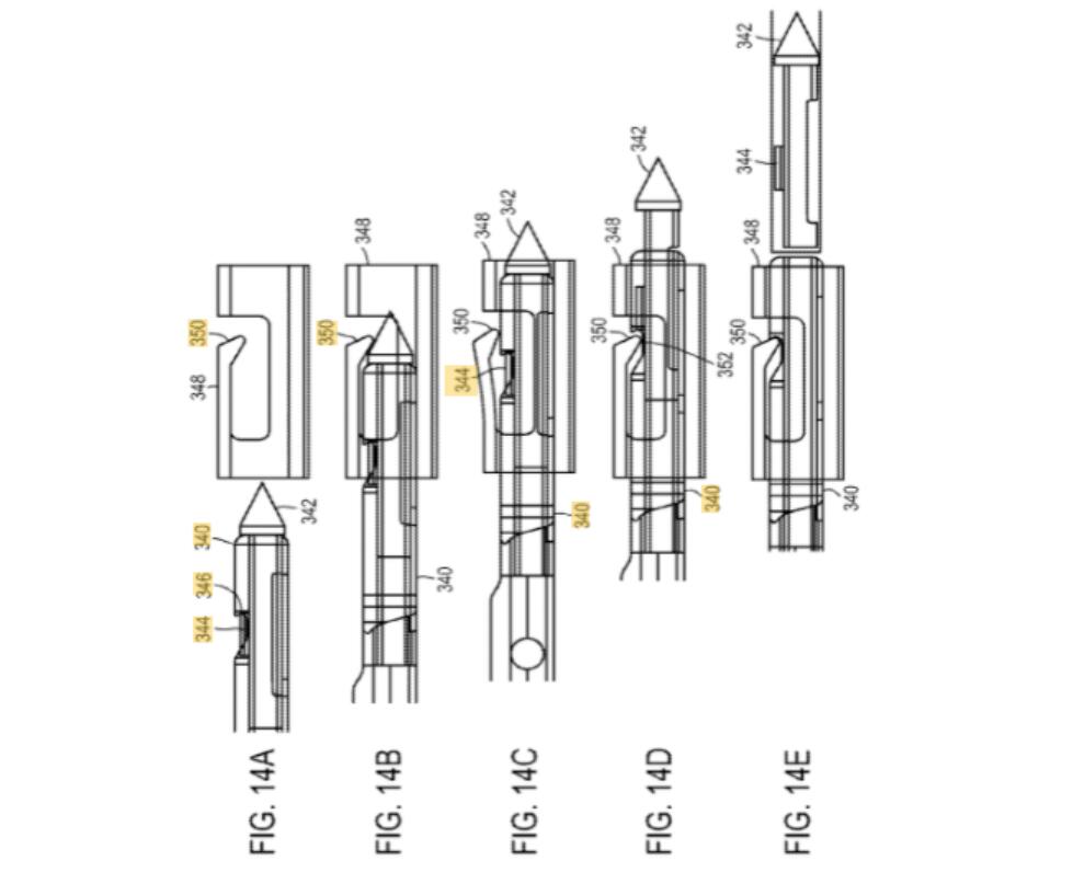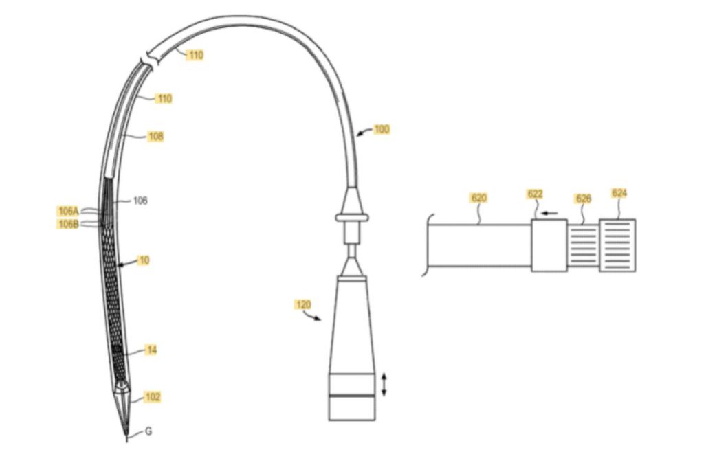 不管自膨式支架外部覆不覆膜,内部带不带瓣膜,这个原理都是一样的。额外地,可通过设计一些不同专利的可逆/不可逆的锁定-释放结构,来控制不同器械的回撤与释放。此处可参考下方图6和图7,为了实现预定功能,不断地加设计,最终搞得太复杂可能并不是件好事。