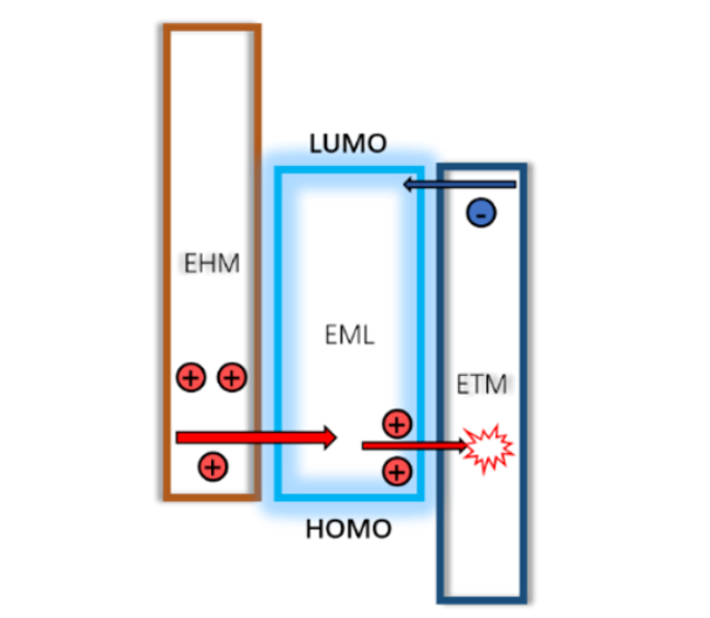 为了防止电子传输层被空穴入侵而导致的老化,通常会设计出最高占据分子轨道(HOMO)能级较深的分子,通过拉大与发光层HOMO能级的能级差来阻止空穴泄露至电子传输层。