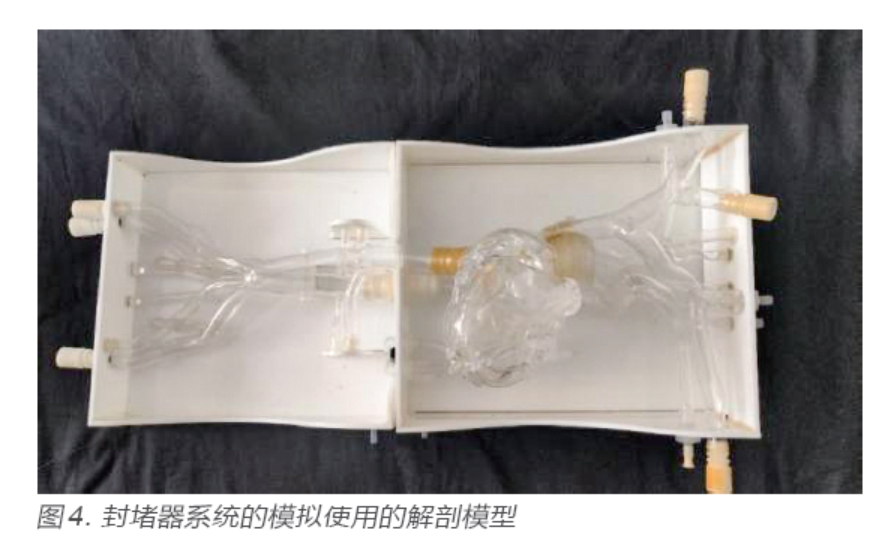 封堵器系统的模拟使用测试的关键是解剖模型的确定,因此,选择解剖模型时宜考虑到封堵器输送到预期植入部位的输送路径的直径、成角、迂曲及血管顺应性等参数。图4给出了封堵器系统的模拟使用模型。