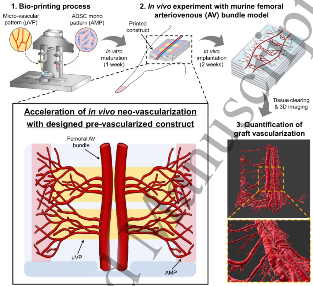预血管化在开发植入式工程3D组织方面受到了极大的关注。虽然已经开发了各种预血管化技术来改善移植物血管化,但尚未研究预血管化模式对体内新血管形成的影响。近日,来自韩国蔚山科学技术学院(UNIST)的Hyun-Wook Kang团队开发了一种功能性预血管化结构,可显着促进移植物血管化,并对各种印刷设计中的微血管模式(µVP)进行了体内评估(图1)。该预血管打印技术将为植入式工程组织/器官的升级提供新的可能性。高端医疗设备展Medtec China 2023近日了解到相关论文“Bioprinting of pre-vascularized constructs for enhanced in vivo neo-vascularization”于2023年4月3日在线发表于杂志《Biofabrication》上。