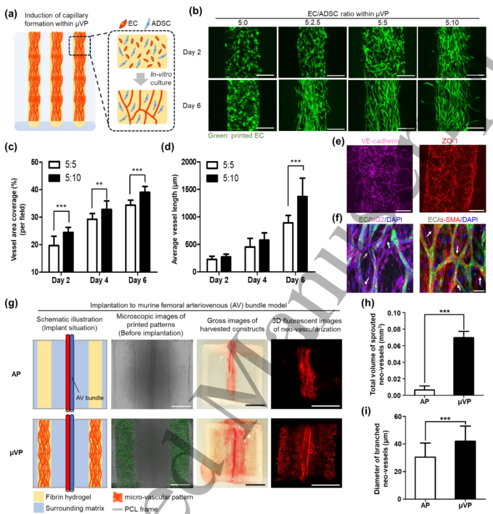 首先,研究者通过共同打印内皮细胞(EC)和脂肪来源的干细胞(ADSC)来诱导高密度成熟毛细管网络产生设计的微血管图案(µVP)。以EGM-2为共培养基,打印包含EC/ADSC生物墨水排列图案的构建体,并在培养过程中观察到毛细管的形成(图2a)。使用含有不同浓度ADSC和固定浓度EC的生物墨水比较毛细管的形成(图2b-d)。最后,确定了用于打印µVP以进行后续实验的最佳EC/ADSC浓度比为5:10。为了确认微血管模式中形成的毛细血管是否具有体内成熟特征,在培养过程中对打印的µVP进行了免疫染色,结果表明:EC可以在ADSC支持下形成成熟的毛细管网络,作为印刷图案中的血管周围细胞(图2e-f)。随后,研究者打印了具有无细胞图案(AP)和µVP的构建体,并用小鼠股动脉血管束模型进行了体内实验(图2g)。结果表明,与AP相比,放置在AV束旁边的µVP显著增加了植入物的新生血管形成(图2h-i)。