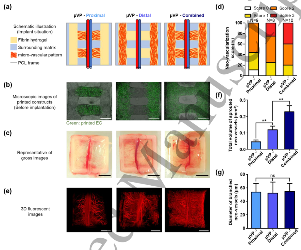 为了研究是否可以通过考虑宿主血管(AV束)的位置控制µVP的设计来诱导加速移植物血管形成,研究者将具有三种不同设计(µVP近端、µVP远端和µVP组合)的预血管化构建体打印并植入AV束模型(图3a)。µVP内的EC在第2天显示出活性发芽形态,并且在植入前(第7天)观察到每组中形成高密度毛细管网络(图3b)。当观察收获的构建体时,获得了2周植入的不同新生血管结果(图3c)。µVP近端和远端组的几个构建体显示出从AV束延伸的粗支血管,而一些µVP组合组的样本主要覆盖着成熟的血管和毛细血管,结果表明µVP组形成了直径相似的分支血管(图3d-g)。