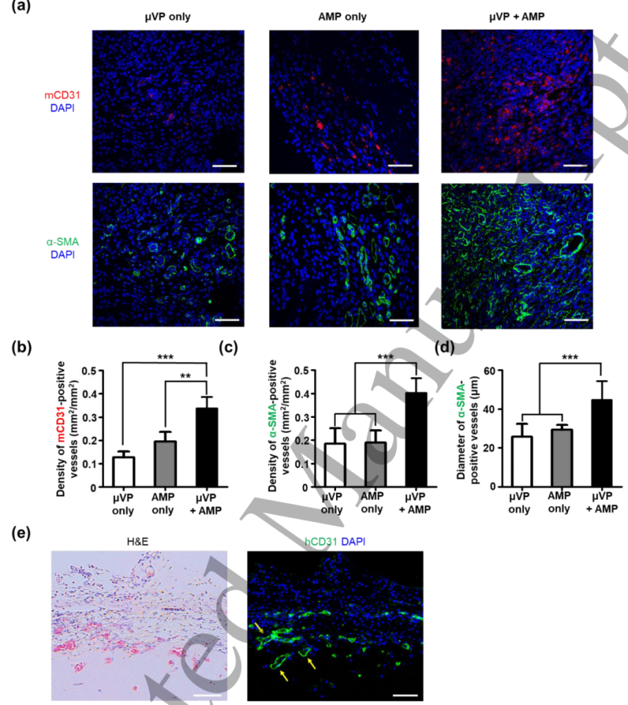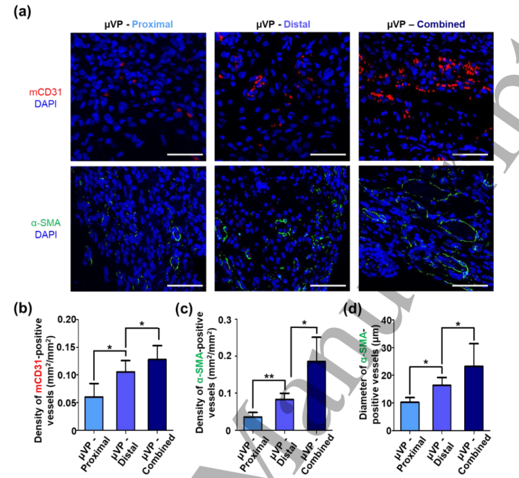 此外,研究者为了验证体积定量结果,分析了免疫组织化学作为新血管化定量的传统方法。用小鼠特异性抗CD31和抗α-SMA进行免疫组织化学染色,以观察构建体内浸润的宿主血管(图4a)。所有量化结果(染色血管的密度和直径)均显示出µVP近端组、远端组和组合组的增加趋势(图4b-d)。证实µVP远端组比µVP近端组显示出更高的新生血管化,具有这两种模式的µVP联合组可以促进显著的移植物血管化。