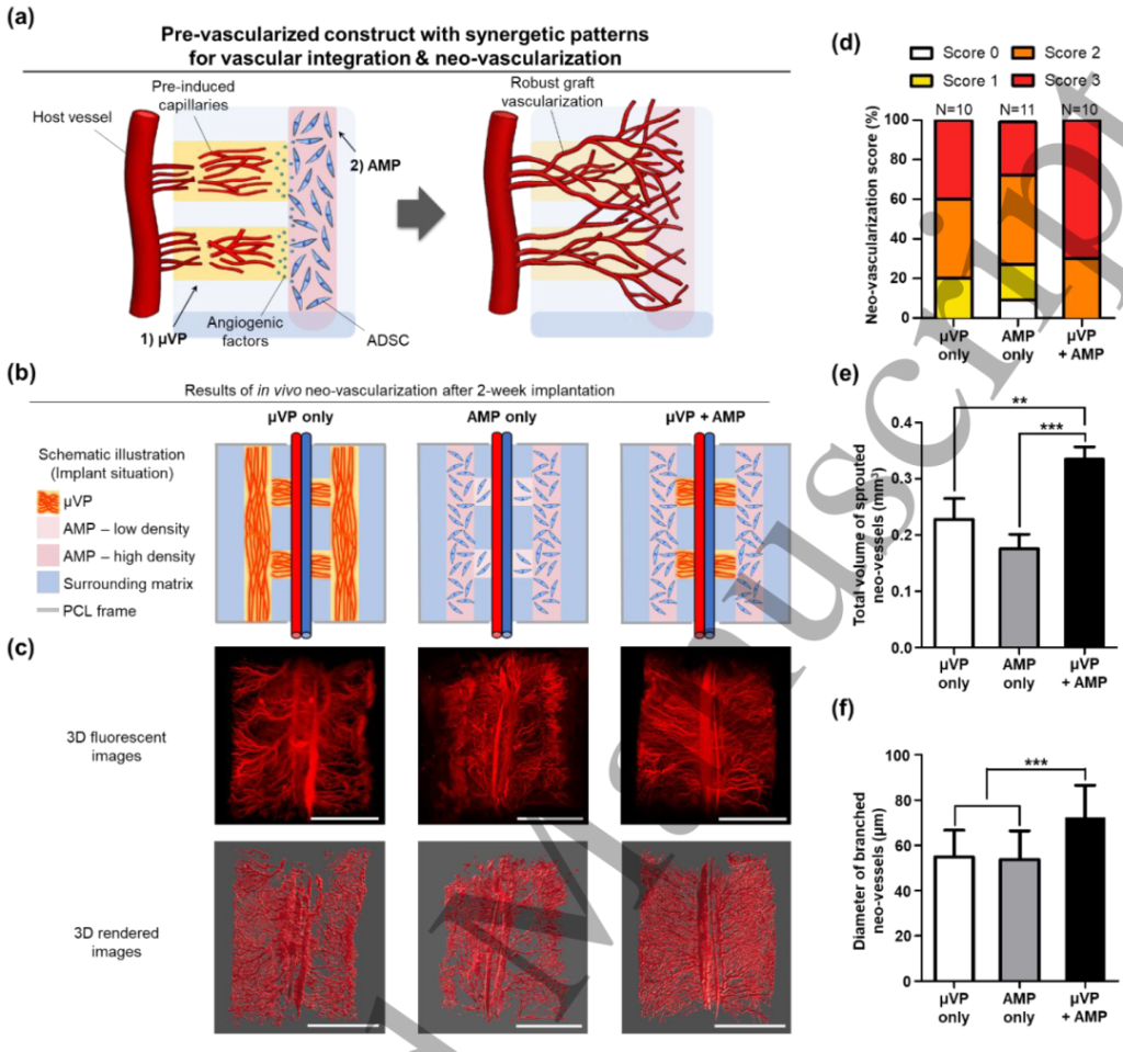 随后,研究者确定AMP是A20的理想条件,并设计了我们新的预血管化构建体(图5a)。将µVP置于宿主血管附近,以集中血管整合能力,而将AMP置于远离宿主血管的位置,以形成血管生成因子梯度。利用这两种模式的协同作用,与之前的结果相比,有望实现强大的移植物血管化。研究了三种不同设计(仅µVP、仅AMP、µVP+AMP)的印刷构建体的体内新生血管化结果(图5b),所有三组在植入2周后都诱导了高血管化结果,但仅AMP组显示出整体较短的新生血管形态(图5c)。比较各组的新生血管化评分,µVP+AMP组的样本更频繁地显示出高分(图5d)。