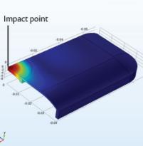 图 5. 钢珠对LVAD 控制器的冲击仿真,用于评估控制器的弹性形变恢复能力。结果显示了沿垂直轴的位移。图注:Impact point – 冲击点