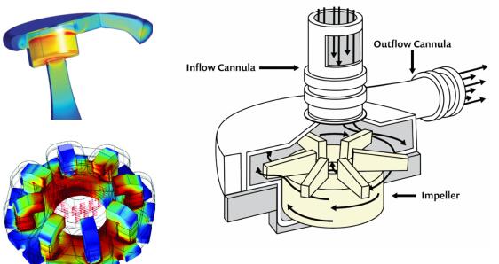 设计 LVA D 时必须考虑到诸多因素:装置必须足够小才能与心脏连接, 并需要使用相容性材料和合理的几何结构才能将其植入人体内而不引起排异反应。另外,设计者还必须考虑流体动力学、供电和热管理等问题。在每个环节的研发中,研发人员都必须清楚地了解多个相互作用的物理效应,因此, 多物理场仿真在整个设计过程起到了至关重要的作用。