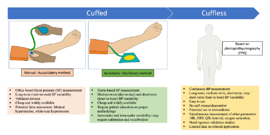 最常用的无袖带血压测量设备是基于光电体积描记的技术(脉搏波形特征、脉搏传导时间、振荡法、透皮光学成像)。光电体积描记术是一种光学方法,用于测量活体组织中血管吸收或反射的光量(图2)。基于光电体积描记法系统的潜在局限性包括因肤色差异、运动伪影和显著的设备间差异(由于使用不同制造商使用的专有机器学习算法)而导致的不准确性。