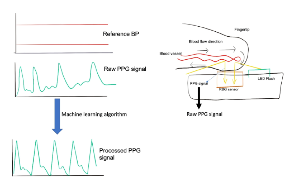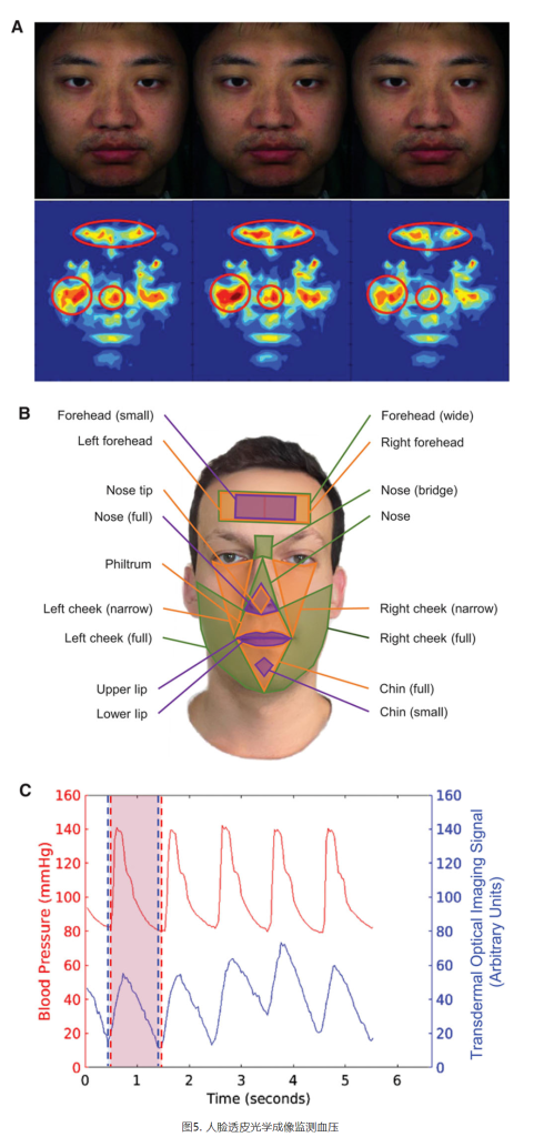 在这种基于摄像机的光电体积描记法中,透皮光学成像(面部的多个区域)、血流数据是使用摄像机收集的。机器学习算法从视频序列的每个图像中提取富含血红蛋白的信号并丢弃富含黑色素的信号。然后使用这组图像提取脉搏波特征数据来计算 血压。这种技术下系统是测量视频中比如面部的血流波形振荡,而不是测量此类区域的血压,因此无法准确校准波形。