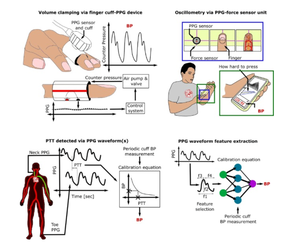 基于 PTT 的血压测量需要至少 2 个传感器同时收集光电容积脉搏波信号和心跳(心音图、心冲击图)来收集 PTT 的特征。因此,基于 PTT 的血压测量的准确性取决于校准质量,并且可能需要对设备进行频繁的重新校准。需要使用方程来进一步估计收缩压和舒张压,这可能会进一步导致不准确。