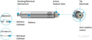 AVEIR DR的两个无导线起搏器设计结构类似于雅培已上市的无线起搏器AVEIR VR。都是由螺旋固定部件(Active fixation helix)、头部电极(Tip Electrode)、电池(Battery)、全套固定部件(Docking/Retrieval Mechansim)等部件组成。