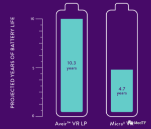 AVEIR DR的无导线起搏器电量是Micra VR的2倍以上,使用更持久。