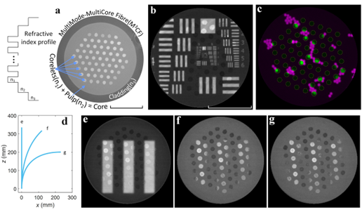 a 多模-多芯光纤横截面;b USAF 1951分辨率测试靶全息成像结果;c 高分辨荧光小球图像;d-g 光纤不同程度变形下多模-多芯光纤成像结果