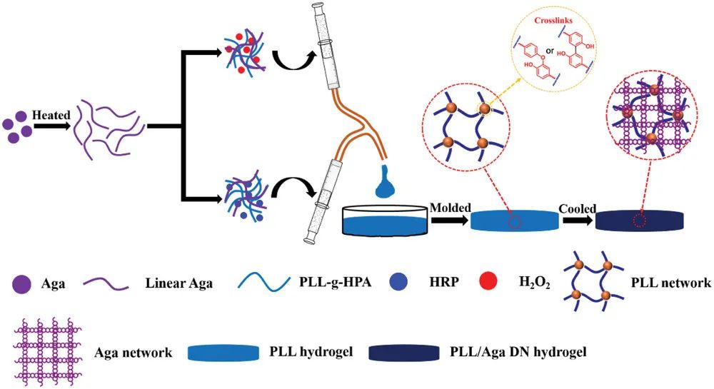 导读:由于缺乏可注射性和固有的抗菌能力,传统的水凝胶难以作为粘合剂敷料用于实际应用。因此,构建具有固有杀菌能力和长期抑菌效果的可注射性水凝胶,并应用于各种形状的创面伤口的原位修复具有重要意义。为此,研究人员开发了一种含聚赖氨酸抗菌组分的抗菌水凝胶。作者将制备的聚L-赖氨酸-接枝4-羟基苯乙酸(PLL-g-HPA)和琼脂糖共混,通过HRP/H2O2介导的酶交联反应,构建了一种具有可注射性和可回收性的双网络水凝胶。实验结果表明加入含阳离子组分的PLL-g-HPA可以使水凝胶具有显著的抗菌能力,可有效防止细菌感染。该双网络水凝胶有望成为伤口敷料的候选材料。
