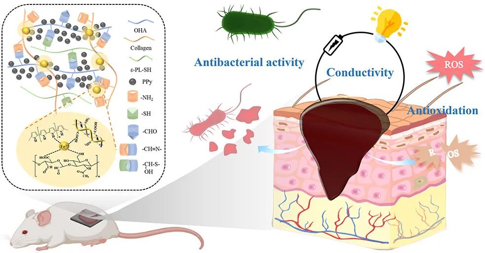 导读:致病性细菌感染和活性氧的极度积累是延缓伤口愈合的常见的干扰因素。因此,具有抗菌和抗氧化活性的伤口敷料有望控制微生物感染和清除活性氧。为此,研究人员设计了一种兼具抗菌和清除活性氧功能的胶原基水凝胶敷料。作者以具有高效抗菌活性的半胱氨酸修饰的聚赖氨酸(ε-PL-SH)作为杀菌组分,将其与胶原蛋白溶液、氧化透明质酸、聚吡咯和Fe3+混合制备水凝胶。ε-PL-SH的引入一方面赋予了水凝胶敷料优异的抗菌性能,另一方面能够通过席夫碱反应促进水凝胶大分子的交联,使其具有良好的力学性能。研究结果表明该水凝胶敷料可以有效缓解持续性炎症反应,促进创面血管的生成和胶原蛋白的有序沉积,从而有效加速创面愈合,提高创面愈合质量。