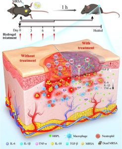 导读:金黄色葡萄球菌是引起皮肤和软组织感染的最常见病原体。耐甲氧西林金黄色葡萄球菌的出现和传播对感染伤口的治疗构成了重大挑战。群体感应是细菌细胞间的一种“通讯”方式,研究表明金黄色葡萄球菌通过群体感应系统控制其生物被膜的形成和毒力因子的分泌。因此,抑制群体感应是抑制生物被膜形成和毒素分泌而不诱导或促进细菌耐药性进化的有效抗菌治疗策略。作为一种阳离子抗菌聚合物,超支化聚赖氨酸已被证明可以通过抑制细菌群体感应的方式来减少细菌生物被膜的形成并抑制细菌感染伤口的炎症反应。基于此,研究人员将超支化聚赖氨酸负载到一种具有活性氧清除能力的水凝胶中作为伤口敷料。研究表明释放的超支化聚赖氨酸组分可以通过阻断群体感应、杀死细菌、抑制炎症和促进血管生成等方式,有效加速细菌感染的全层伤口的愈合。
