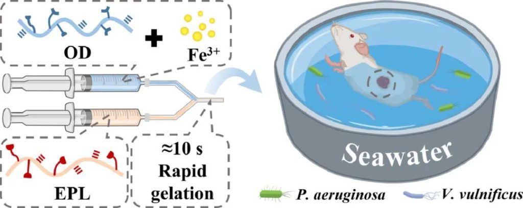 导读:由于海水中盐度高、高渗和存在各种致病菌,因此海水浸泡的伤口容易导致组织坏死、感染、愈合时间延长,并可能造成患者死亡。然而,目前的伤口敷料难以实现牢固稳定的湿粘附和抗菌性能,从而限制了其在海水浸泡伤口中的应用。为此,研究人员基于贻贝启发的策略,首先利用邻苯二酚基团修饰的氧化透明质酸,再与聚赖氨酸和Fe3+结合,通过席夫碱反应、金属螯合、阳离子-π和碱性条件下的静电相互作用制备了一种多功能的水凝胶敷料OD/EPL@Fe用于治疗海水浸泡伤口。水凝胶中的邻苯二酚基团通过π-π堆积、金属络合、氢键和共价交联等作用提供强大的湿粘附。同时,儿茶酚-Fe3+配位对水凝胶具有光热作用,与聚赖氨酸固有的抗菌活性相结合,表现出优异的抗菌和生物膜形成抑制作用。实验表明二者的协同作用会破坏细菌和变性酶的细胞膜,导致细菌死亡,展现出更好的抗菌活性和生物被膜抑制能力。