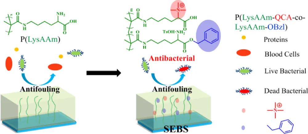 导读:血液相容性和抗菌性能对于血液接触装置和医疗介入材料至关重要。聚赖氨酸及其衍生物具有广谱抗菌性能以及优异的生物相容性;此外,其分子链中含有多个易修饰基团(如氨基和羧基),便于通过化学修饰的方法引入各种活性基团和组分,因此采用其对医用材料表面进行改性有望赋予植/介入物材料以多功能性。例如,研究人员将带有正电荷的季铵盐组分和疏水性苄基组分修饰到亲水性甲基丙烯酰化赖氨酸上,得到两种功能单体;随后在基材表面通过表面引发聚合的策略来接枝聚合物刷,制备抗菌表面。实验表明,亲水性主链结构赋予了表面优异的抗污性能,而季铵盐和苄基组分则增强了表面的杀菌能力。这种改性策略在血液接触装置和医疗介入材料方面具有广阔的应用前景。