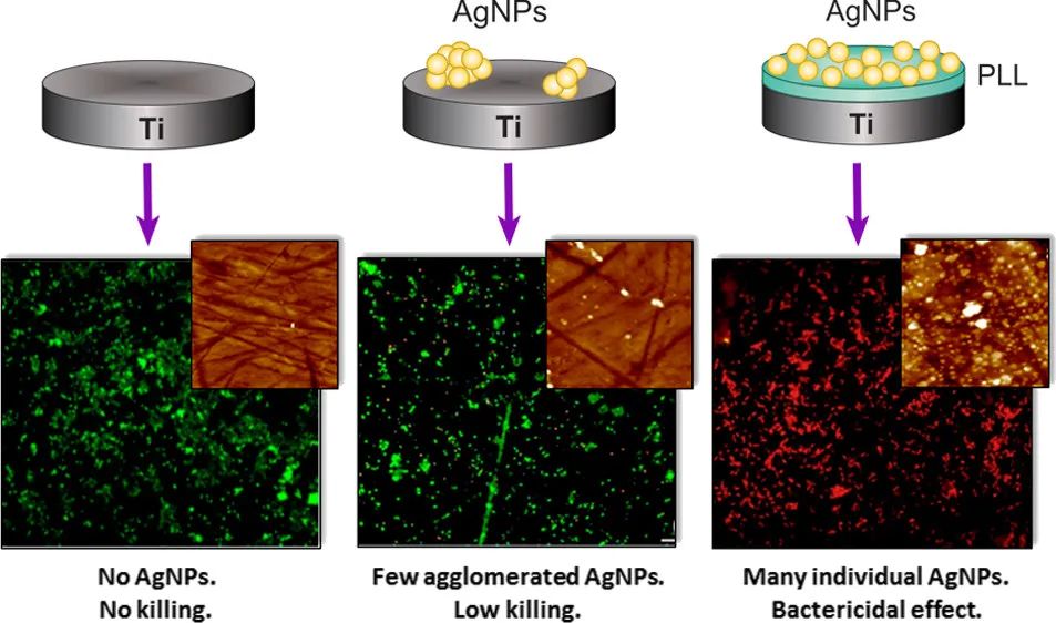 导读:构建具有多种杀菌功能协同作用的表面涂层是解决植/介入物细菌感染的可行之策,在多种杀菌策略的协同作用下,能够实现“1+1>2”的抗菌效果,然而如何通过简单的方法构建多模式协同抗菌涂层仍然是一个技术难点。聚赖氨酸因其阳离子特性而具有广谱杀菌能力,适用于表面涂层的构建;此外,其正电荷性也可用于固定带有负电荷的杀菌组分,从而将多模式杀菌功能集成到同一表面。例如,研究人员将带有负电荷的柠檬酸盐封端的银纳米粒子(AgNPs)结合到涂有聚赖氨酸的钛合金表面,研究发现聚赖氨酸涂层可以有效抑制AgNPs在表面的团聚,从而增强其抗菌效果。抗菌实验表明,与对照组相比,改性表面表现出增强的抗菌性能,能够杀死超过3个数量级的金黄色葡萄球菌和铜绿假单胞菌,可以有效避免钛基植入物表面的细菌生长和增殖。