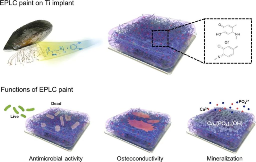导读:理想的骨科植入物需要具备抗感染和促进骨传导等多种功能,同时也需要具有广谱适用性来满足不同植入物基底的需求。因此,研究人员将聚-赖氨酸和儿茶酚通过一步化学交联来制备了一种有具有高效抗菌和骨传导能力的功能涂层EPLC。研究表明该涂层对大肠杆菌和MRSA表现出超过99.99%的抑菌活性,并能抑制MRSA生物膜的形成长达一周。此外,该涂层可以通过促进小鼠成骨细胞前MC3T3-E1的粘附和增殖来提高钛植入物表面的骨导电性。在模拟人体体液中孵育2周后,涂层可诱导羟基磷灰石形成。