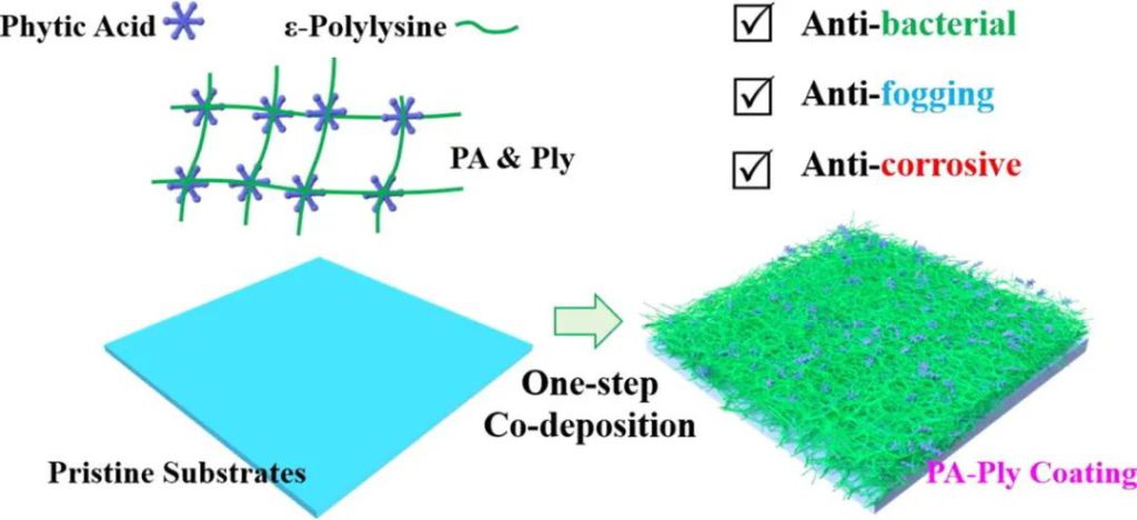 导读:对材料表面进行改性可以赋予其抗菌、防腐和防雾等多种功能,在工业设备和医用植/介入材料领域具有广泛的应用前景。然而目前缺乏一种简便且具有基材普适性的方法实现多功能表面的制备。为此,研究人员开发了一种基于天然提取物植酸和聚赖氨酸的表面改性策略来实现这一目标,他们将植酸和聚赖氨酸共混并通过一步法直接沉积到基材表面。与未改性基材相比,改性表面可以杀死超过99.9%的革兰氏阳性和阴性细菌,并在体内实验中能够起到有效的抗感染作用。此外,该涂层还具有优异的防雾性能和促进内皮细胞增殖的能力,通过电化学腐蚀模型也证明了该涂层具有优异的防腐性能。因此,这种改性策略能够适用于多种应用场合。