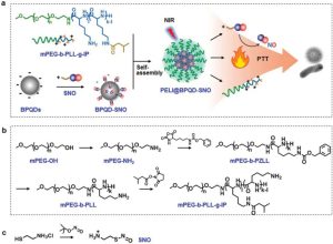 导读:为了应对全球抗生素耐药性危机,人们已经开发出了包含光热疗法在内的多种基于物理作用的非抗生素治疗策略。然而,研究表明需要达到60℃的高温才能够有效消融细菌,这无疑会对健康组织造成不可逆转的损伤。将其他治疗策略与光热疗法结合有望通过协同作用实现安全高效的抗菌治疗效果。例如,研究人员设计了一种结合抗菌肽模拟物、气体疗法和光热疗法的多模态抗菌平台。具体而言,研究人员首先合成了含聚赖氨酸组分的阳离子共聚物PELI;接着将NO供体SNO通过静电作用吸附到黑磷量子点,得到功能组分BPQD-SNO;最后,将PEIL和BPQD-SNO进行静电自组装得到纳米粒子PEIL@BPQD-SNO。在近红外光的照射下,材料产生热量来按需释放NO和赖氨酸基共聚物;NO可以对细菌细胞膜造成氧化损伤,进而提高细菌对热量和阳离子聚合物的敏感性,产生协同抗菌功效。该设计能够实现光控的杀菌剂递送,无需使用任何抗生素,为解决细菌耐药性危机提供了一种可行的方案。