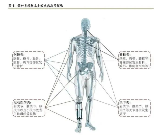 骨科植入医学器械通常用于骨科治疗,主要用于植入人体并用作取代或辅助治疗骨科疾病的医疗器械,可以分为创伤植入物、脊柱植入物、关节植入物和运动医学植入物。