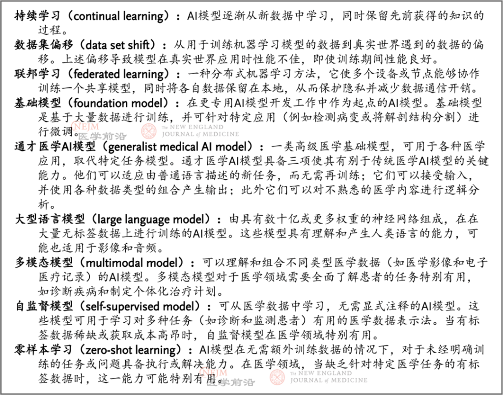 AI模型(包括自监督模型、多模态模型、基础模型,特别是用于文本数据以及用于影像和文本综合数据的大型语言模型)的快速发展有可能加快该领域进程。大型语言模型指的是由具有数十亿或更多权重的神经网络组成,在在大量无标签数据上进行训练的AI模型。对用于医学领域文本任务的大型语言模型进行的早期研究包括GPT-4等聊天机器人,结果表明这些模型在作医疗记录、回答问题和会诊方面达到临床专家水平。