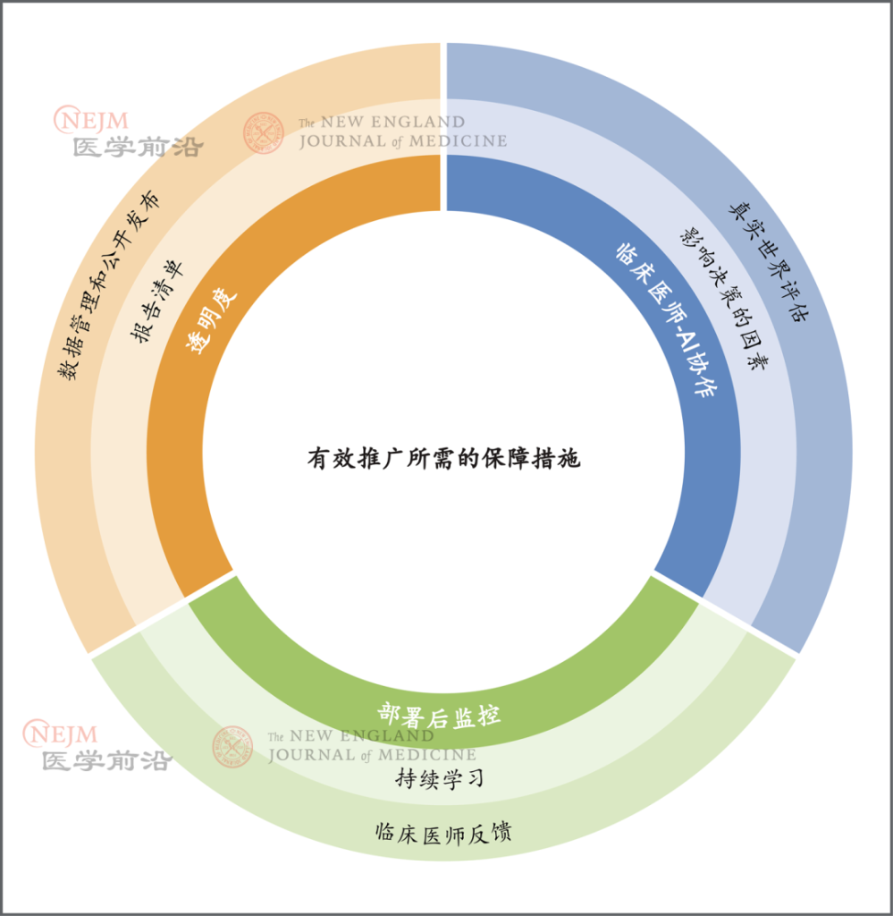 我们亟需设计出一些方法来改进AI算法在新环境中的推广。随着该领域的成熟,在算法被广泛应用之前,必须基于公认标准,为推广算法建立更好的检查机制。上述检查包括三个相关领域:临床医师-AI协作、透明度和监控(图2)。
