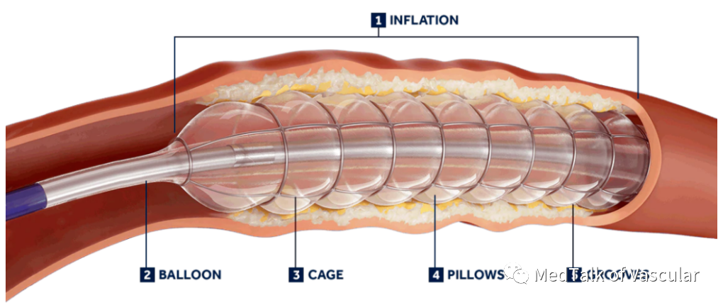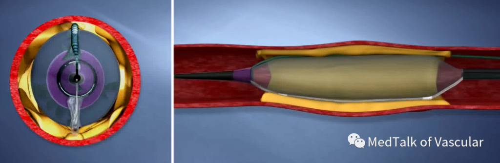 4)巧克力球囊:在球囊表面包裹一种镍钛合金丝的笼状结构,设计用于1:1口径大小的血管,以最大限度地减少限流性夹层和减少弹性回缩;当球囊充盈打开时,笼状的镍钛合金丝会使球囊沿着整个病灶形成一系列分段的枕部和凹槽,枕部施加压力产生微小夹层以达到有效扩张,凹槽则可缓冲应力,阻止夹层扩展;该设计可以使球囊在扩张时可控,同时减少“狗骨头效应”以及降低球囊轴向伸长率。
