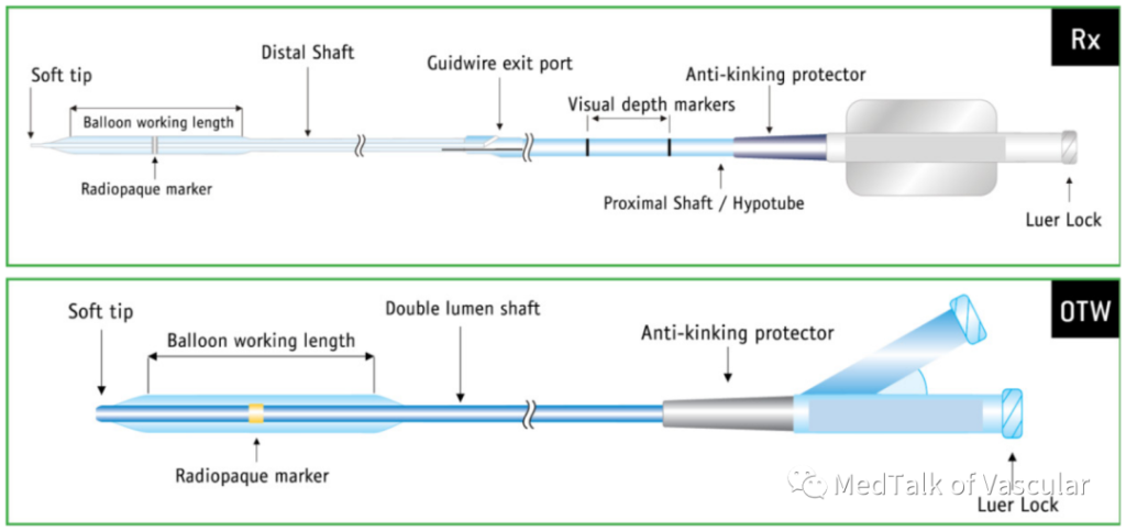 由于临床需求的因素,球囊导管目前有两种主流的结构,一种是快速交换型(Rapid exchange,Rx),另一种是导丝通过型(Over the wire,OTW);下图为两种结构的示意图: