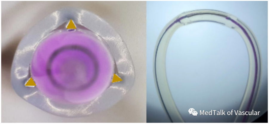 3)刻痕球囊:在球囊表面分布有圆形导丝或者是异型金属部件,如双导丝球囊(业聚医疗)、三导丝球囊(博迈医疗&鼎科医疗),其中业聚的双导丝截面呈圆形,博迈和鼎科的呈等边三角形,当球囊充盈扩张起来时,球囊表面的圆形导丝或异型金属部件对斑块有一定的切割作用;单从刻痕丝的结构来讲,博迈和鼎科的刻痕球囊在钙化治疗上会更胜一筹;