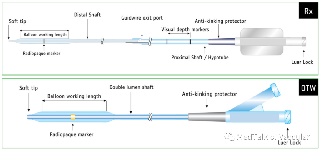 目前,临床使用的球囊扩张导管有快速交换型(Rx)和导丝通过型(OTW)两种类型;如下图所示: