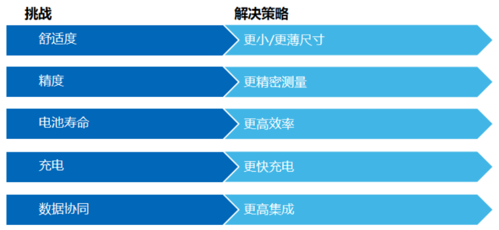 可穿戴技术面临的最普遍的挑战是追寻更小尺寸且功能强大的电源解决方案,难点在于提高电池的续航能力。总体而言,舒适度、精度、电池寿命、充电、数据协同是可穿戴设备当下面临的普遍挑战。
