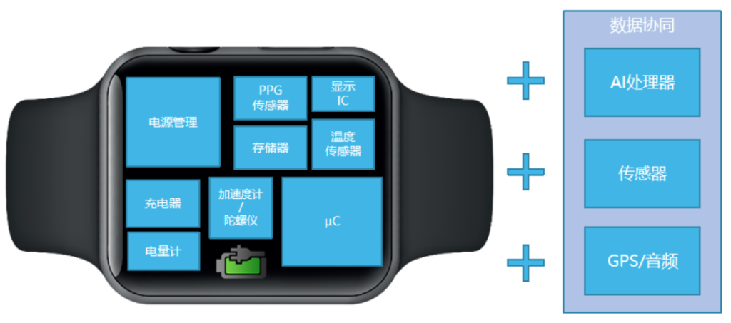 但是,随着更多功能的加入,可穿戴设备会面临空间限制的挑战。首先,组成系统的传统组件并未减少,比如电源管理、电量计、微控制器、存储器、温度传感器、显示屏等;其次,鉴于人工智能已成为智能设备日益增长的需求之一,需要加入 AI 微处理器以方便数据分析并提供更为智能的输入输出,比如通过音频输入支持语音控制;